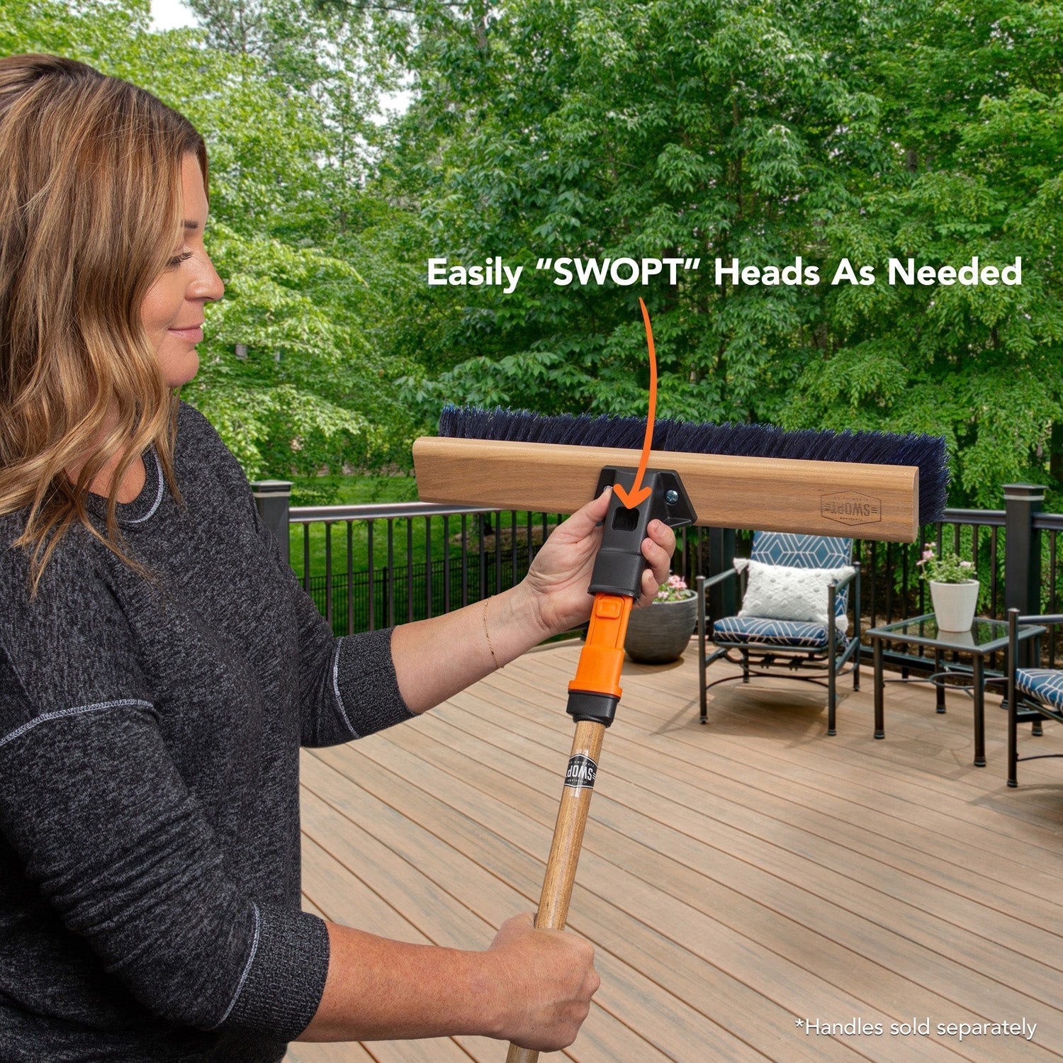 Effortlessly sweep away dirt and debris with SWOPT push brooms. Our brooms are unlike any other broom you've used before. Part of our interchangeable cleaning system that allows you to "swopt" heads and handles at the push of a button, you can take the bore out of the chore. With a simple snap, lock and clean and you'll have your home or outdoor space looking pristine in no time.