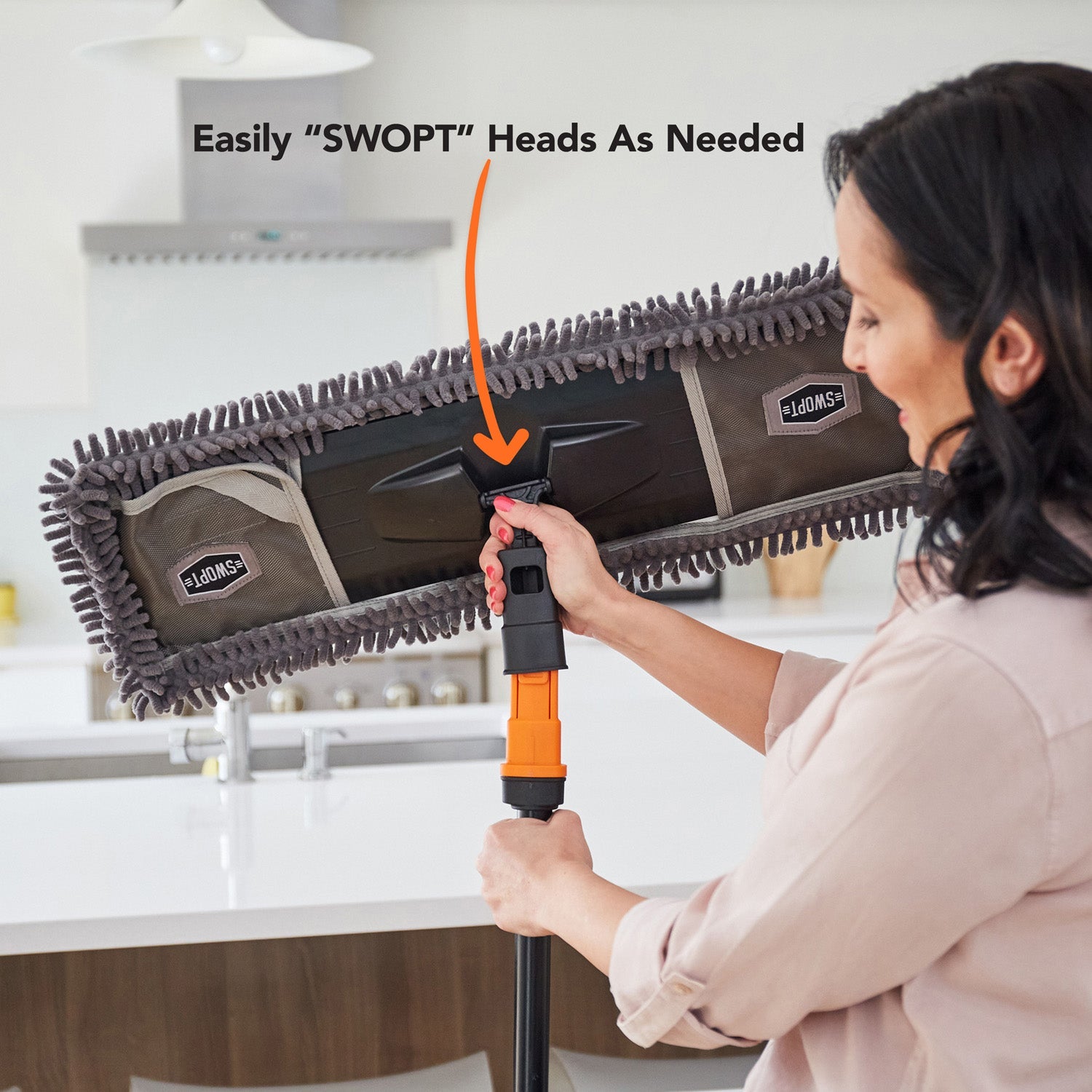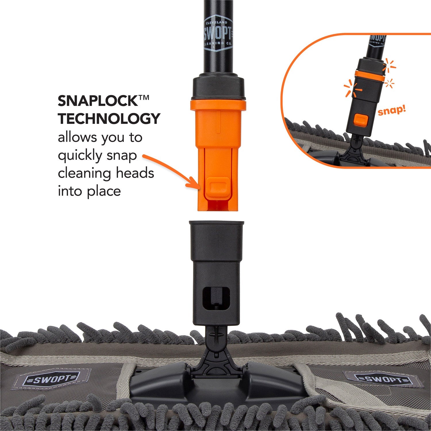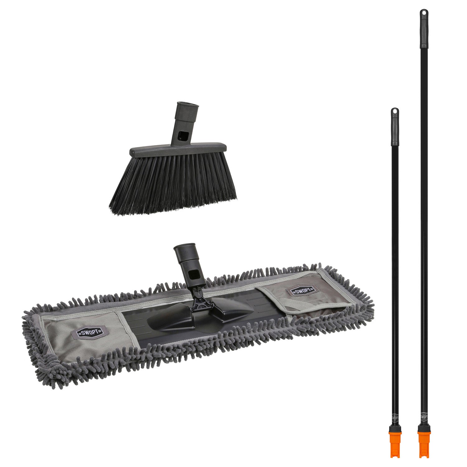 SWOPT cleaning kits are your ultimate solution for a sparkling clean home, garage, or outdoor space. Experience the future of cleaning with our patented Snaplock Technology that makes it super simple to "swopt" a head or handle with a push of a button. Our kits offer an array of cleaning handles, tools and attachments that are designed to make your cleaning routine more efficient and cost-effective - whether you're sweeping, mopping, or dusting. With a SWOPT kit, you get to enjoy a cleaning system that is functional, versatile, space-saving, and aesthetic for all your cleaning needs from floor to ceiling.